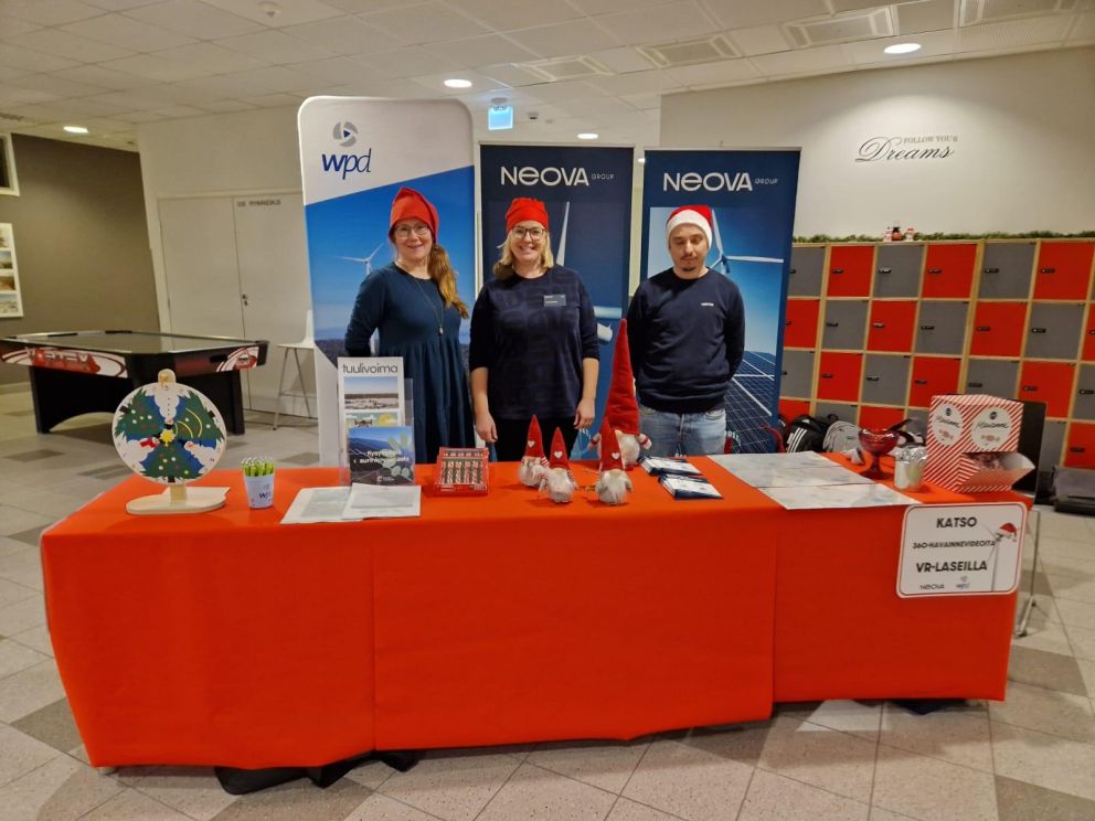 Esiinnyimme tänä vuonna yhteistyössä hanketoimija Neova kanssa yhteisen messupöydän ääressä. Meillä molemmilla toimijoilla riitti monenlaista vilinää, kun kysymyksiä sateli niin omasta wpd Tuohimaa-Riutanmaan tuulivoimahankkeestamme kuin myös Neovalla Kairineva-Peränevan tuuli- ja aurinkovoimahankkeesta. Erityistä innostusta herätti mahdollisuus tarkastella VR-laseilla sitä, miltä tuulivoimalat näyttäisivät tutuissa maisemissa. Myös jouluinen onnenpyörä houkutteli kävijöitä.