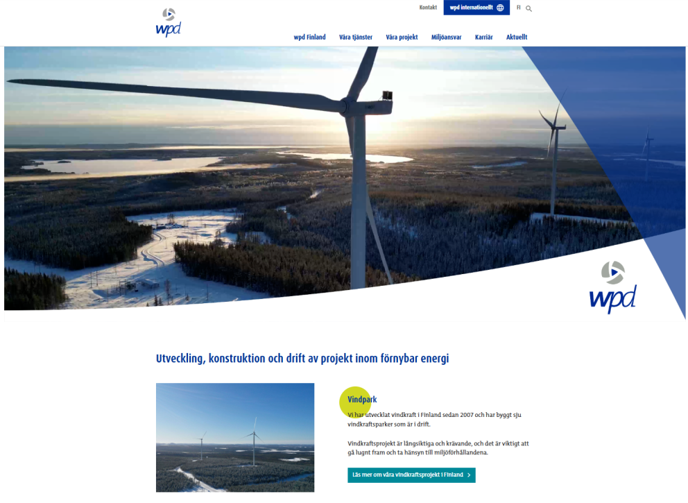 Innehållet på wpd Finlands webbsidor finns nu även tillgängligt på ett annat inhemskt språk. Wpd har även vindkraftsprojekt i svensktalande områden, såsom Söderskogen i Vörå och Nydalabacken i Kronoby, så det är av största vikt att vi kan betjäna våra nuvarande och framtida partners på deras eget språk.